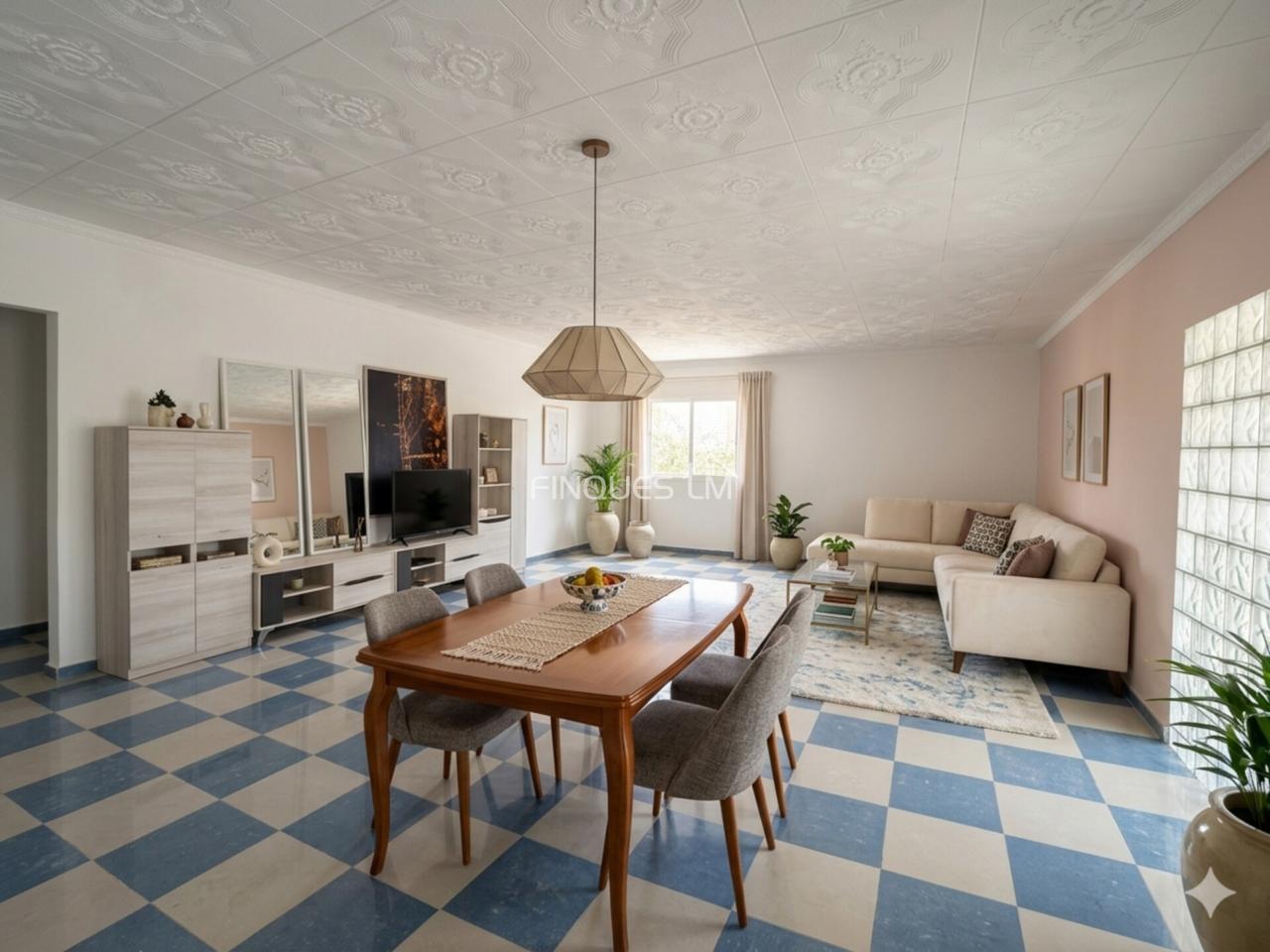 100m2 y última planta de 40m2. Tiene un terreno llano de 590m2. La casa se distribuye de la siguiente manera: porche de entrada, amplio salón comedor con cocina con una
